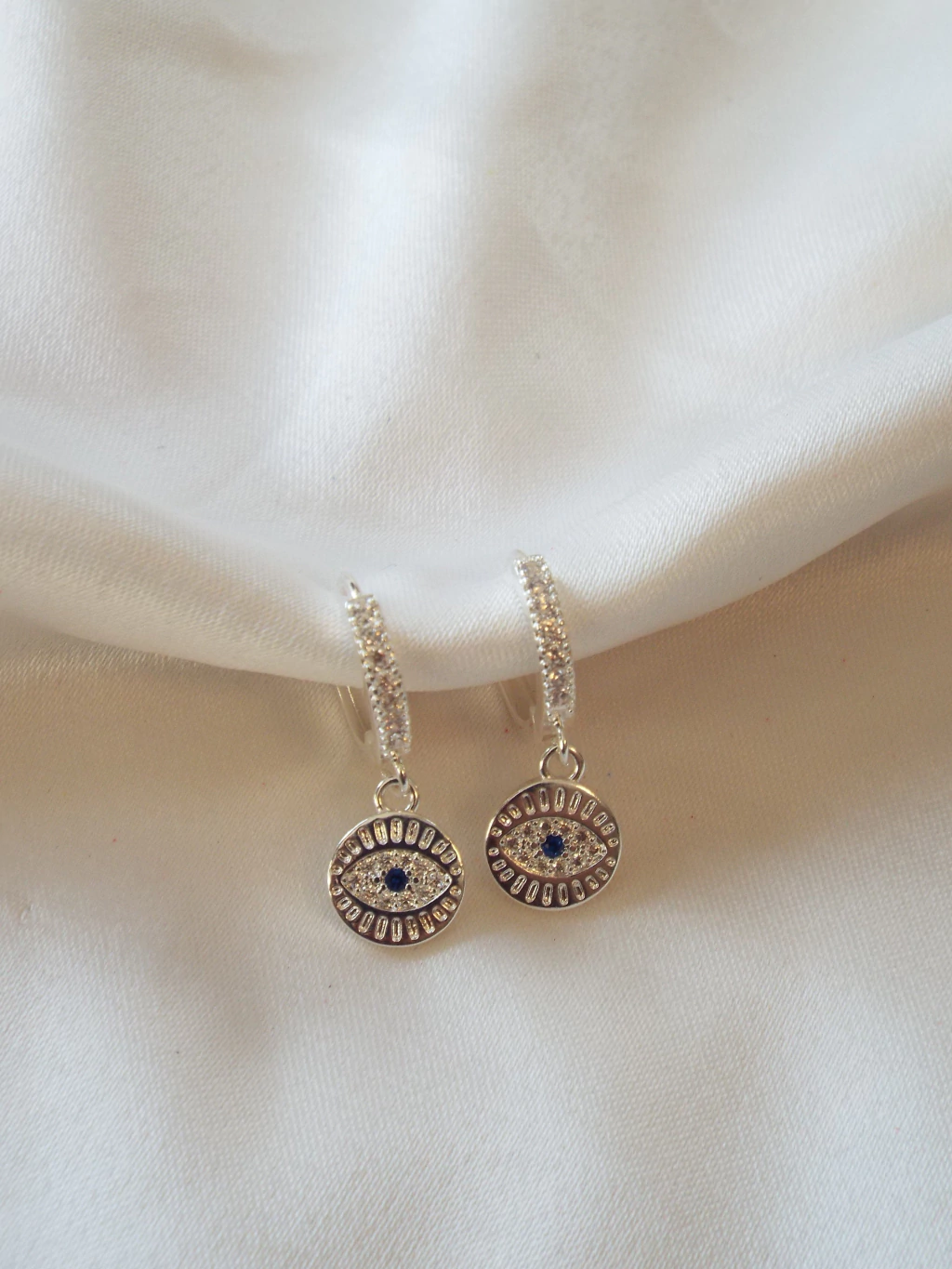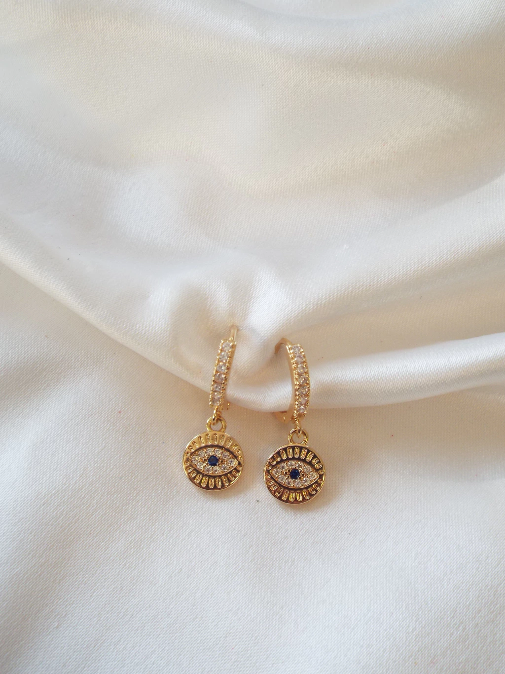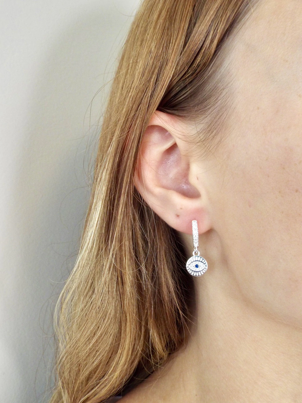 Brinco de mini argola com zircônias cravejadas e pingente de olho grego com zircônias. Uma peça delicada e versátil que une brilho, modernidade e um toque clássico. Ideal para quem busca acessórios femininos finos e atemporais, perfeitos para usar sozinhos ou em composições de brincos.