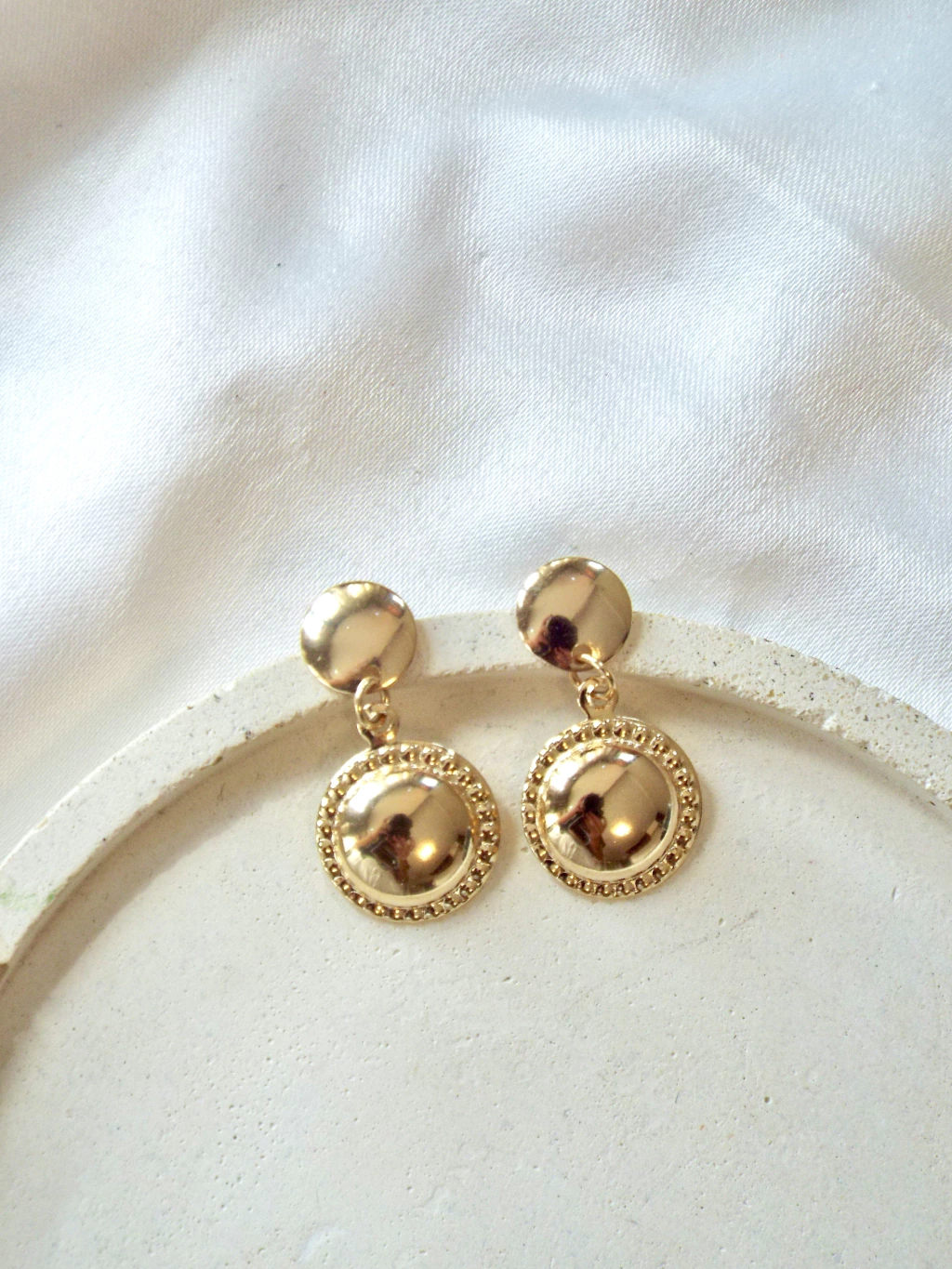 Brinco com pingente de medalha. Peça pequena e leve. O brinco acompanha duas opções de tarracha: de metal e de silicone.