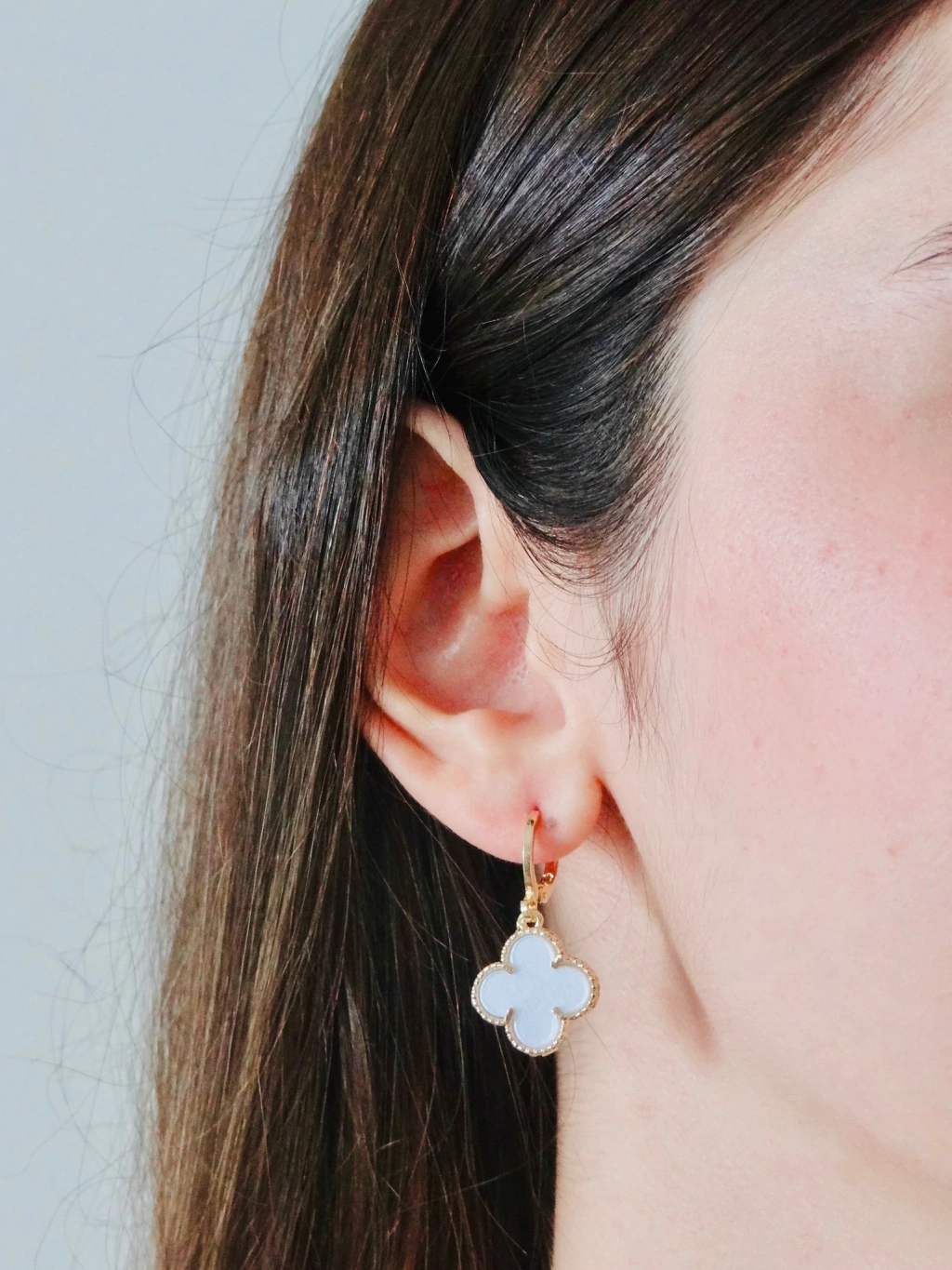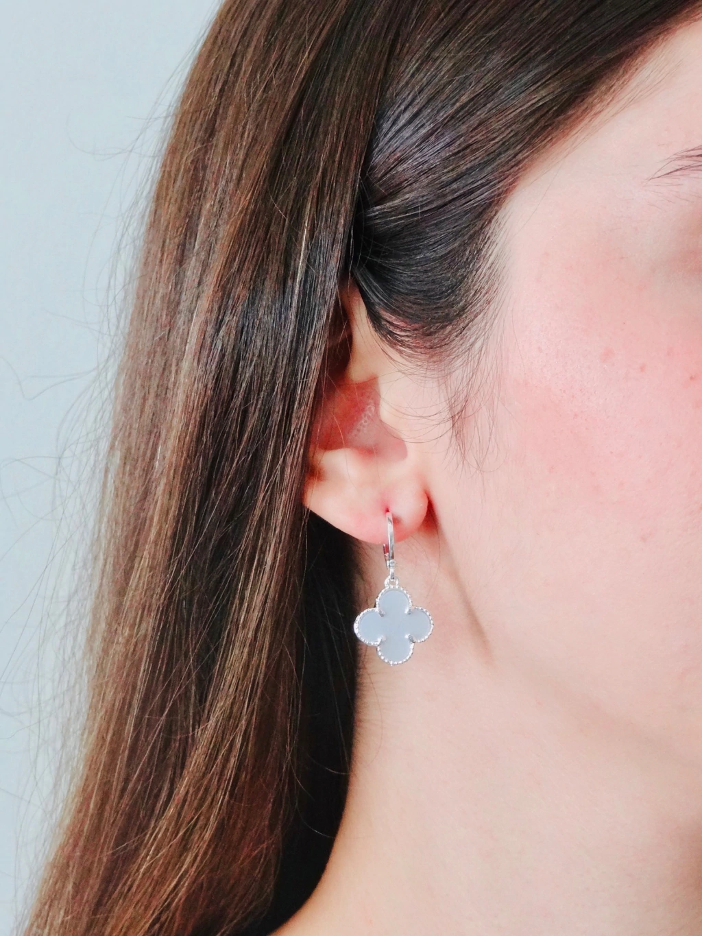Brinco leve, com pingente de trevo texturizado. Possui fecho de encaixe.