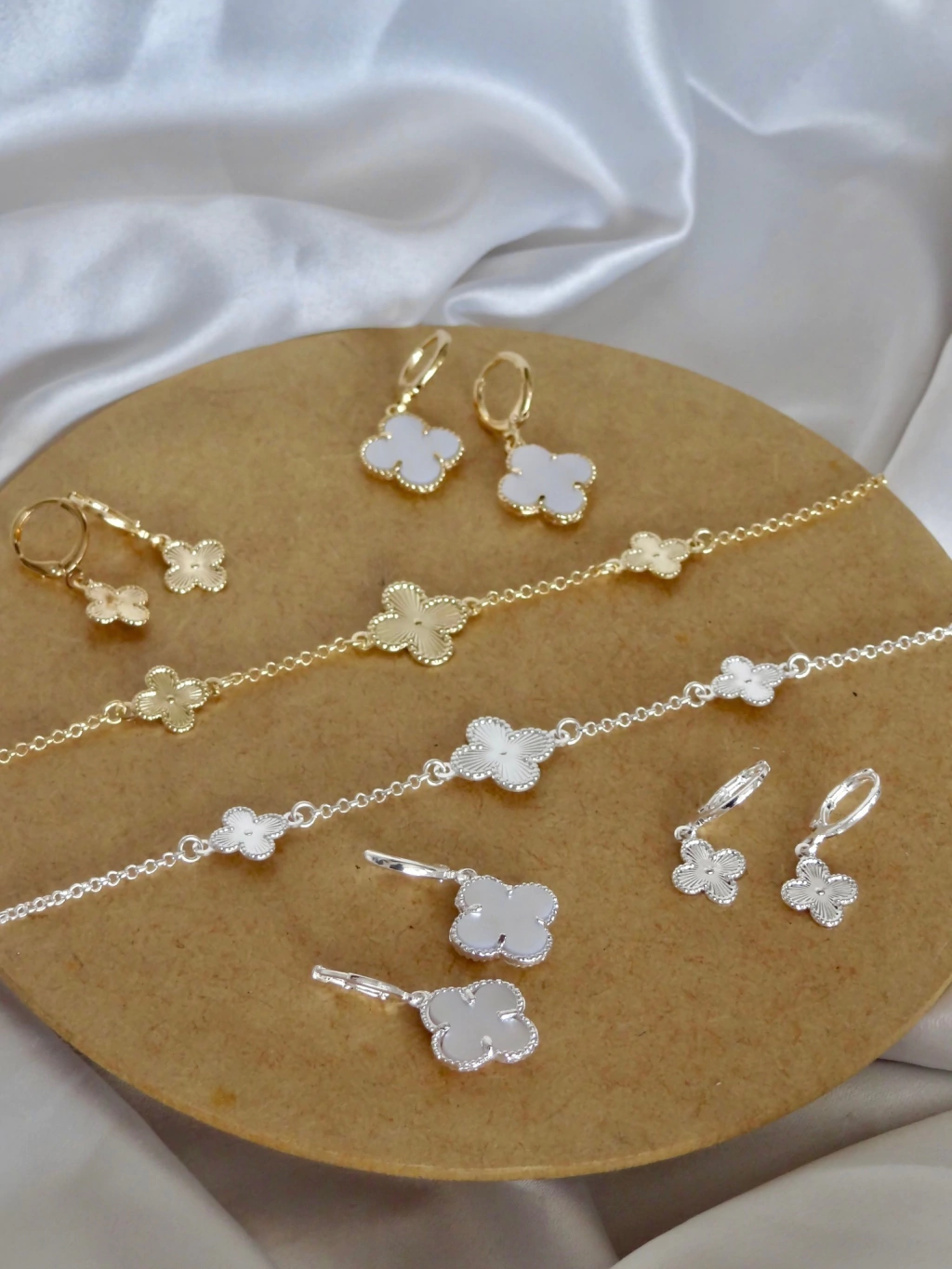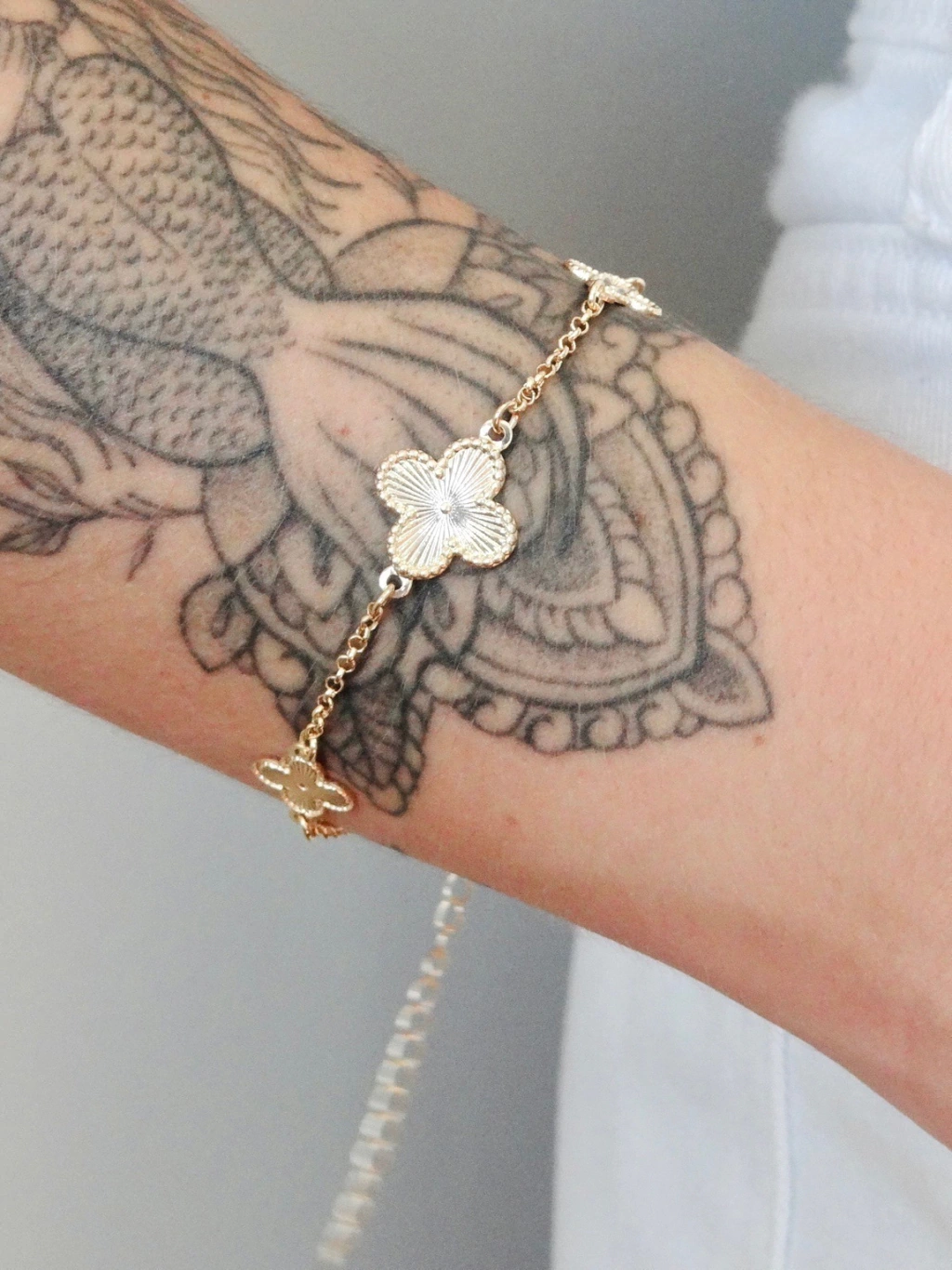 Pulseira delicada com corrente fina e três trevos de 4 folhas com textura, distribuídos ao longo da peça, representando abundância e boas energias, ideal para quem aprecia detalhes sutis e cheios de significado.